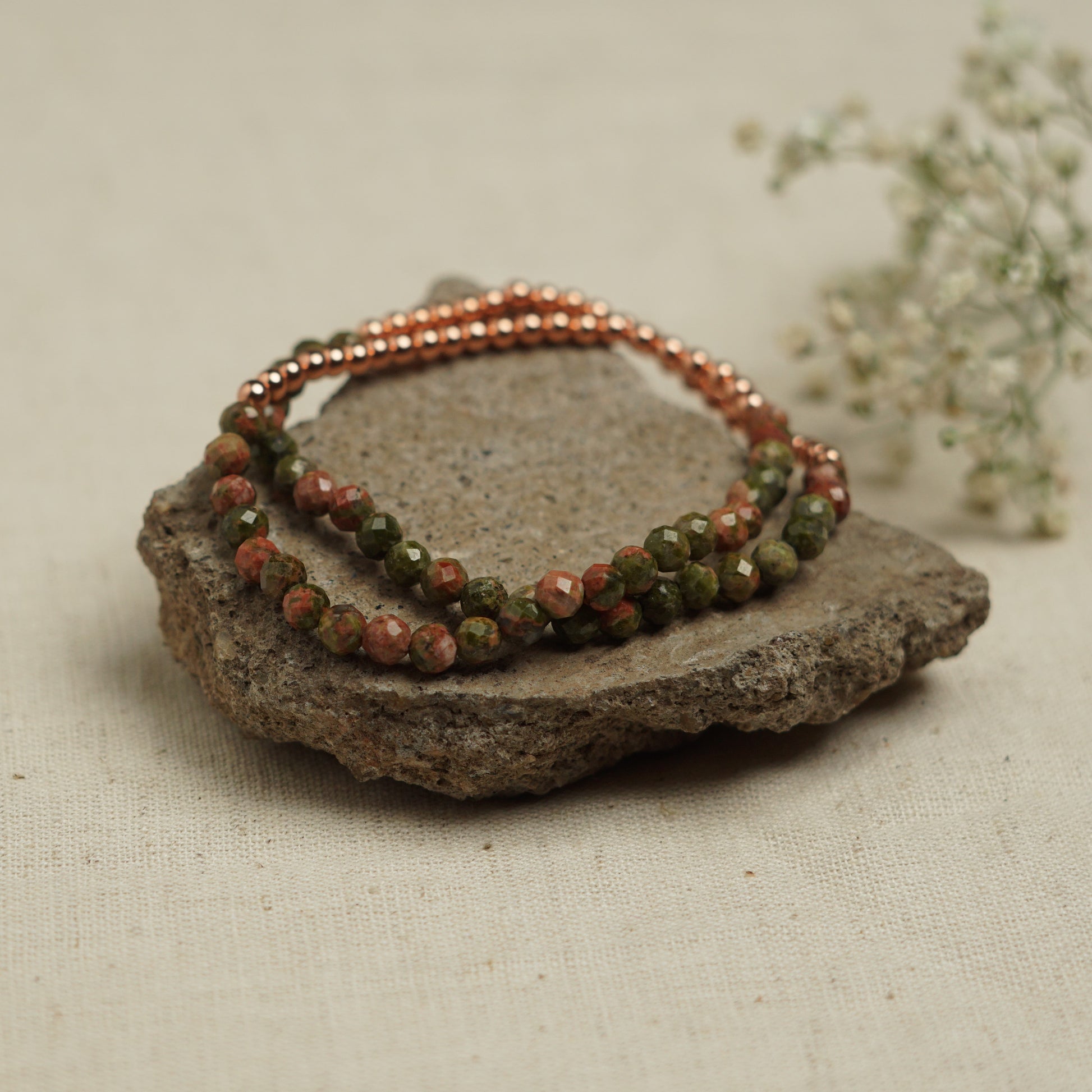 Dainty and Minimal Stretchy bracelets with multi-faceted 4mm Unakite + 3mm Solid copper beads