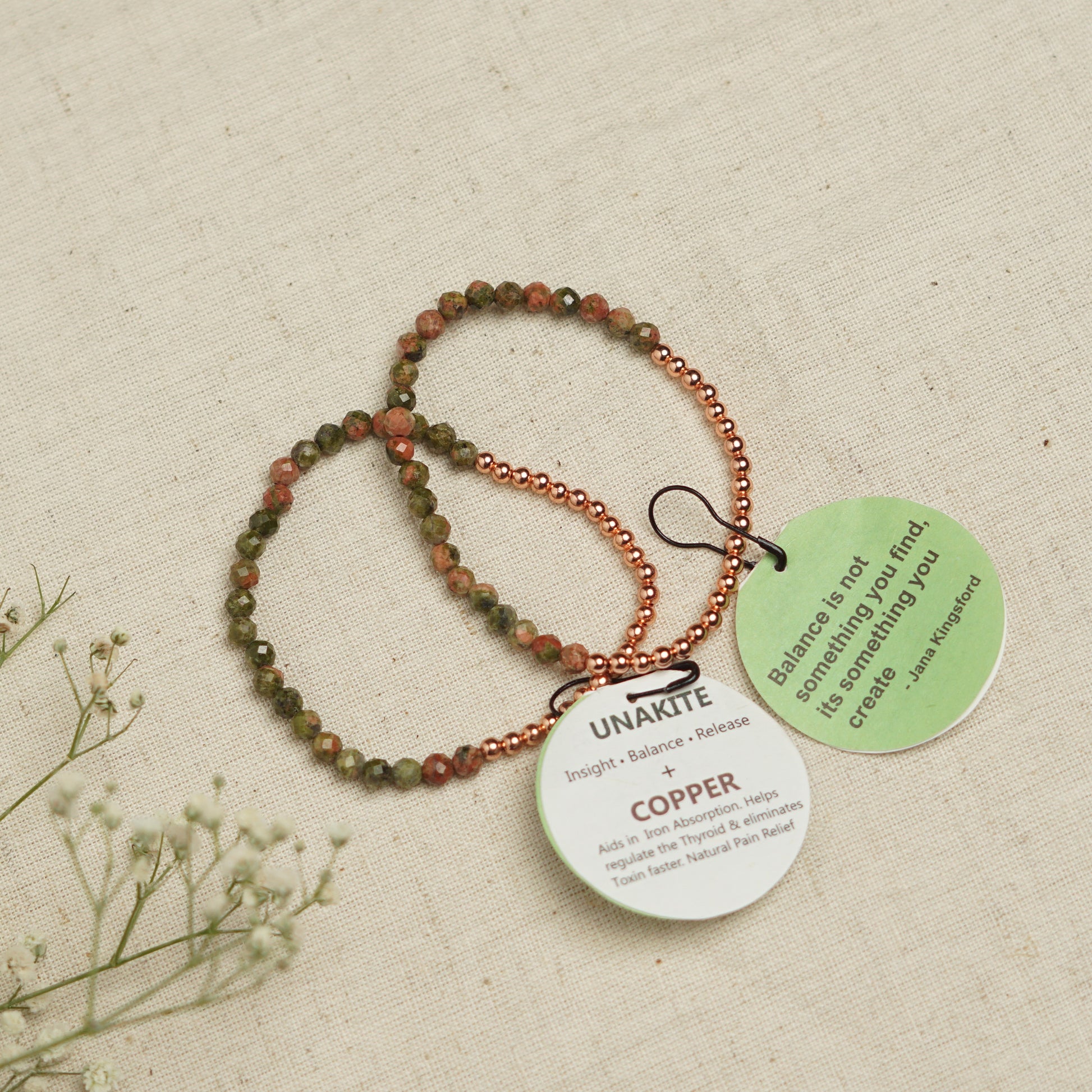 Every bracelet comes with a tag that lists the properties of the gemstones and copper and is packed in a cotton pouch.