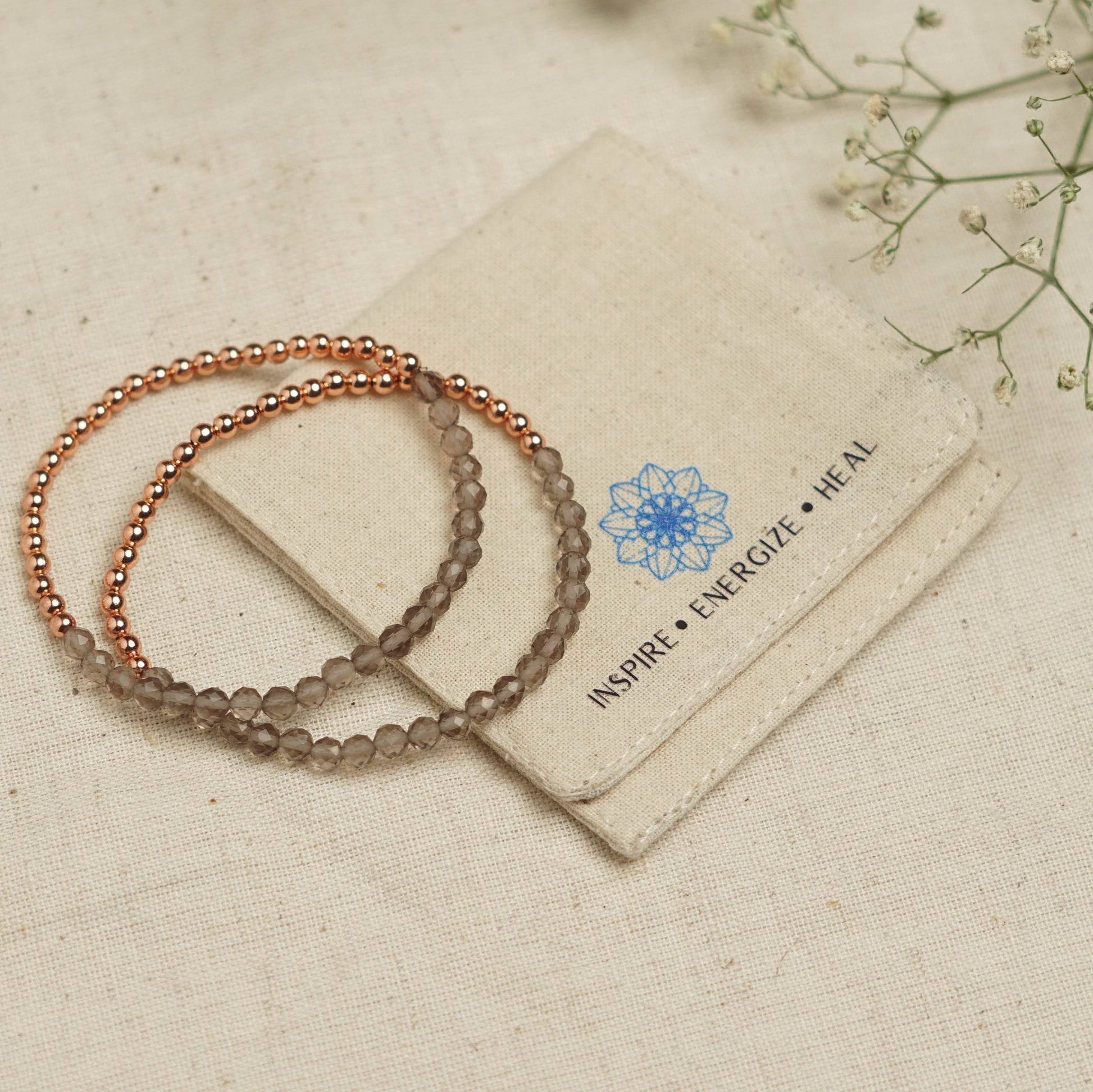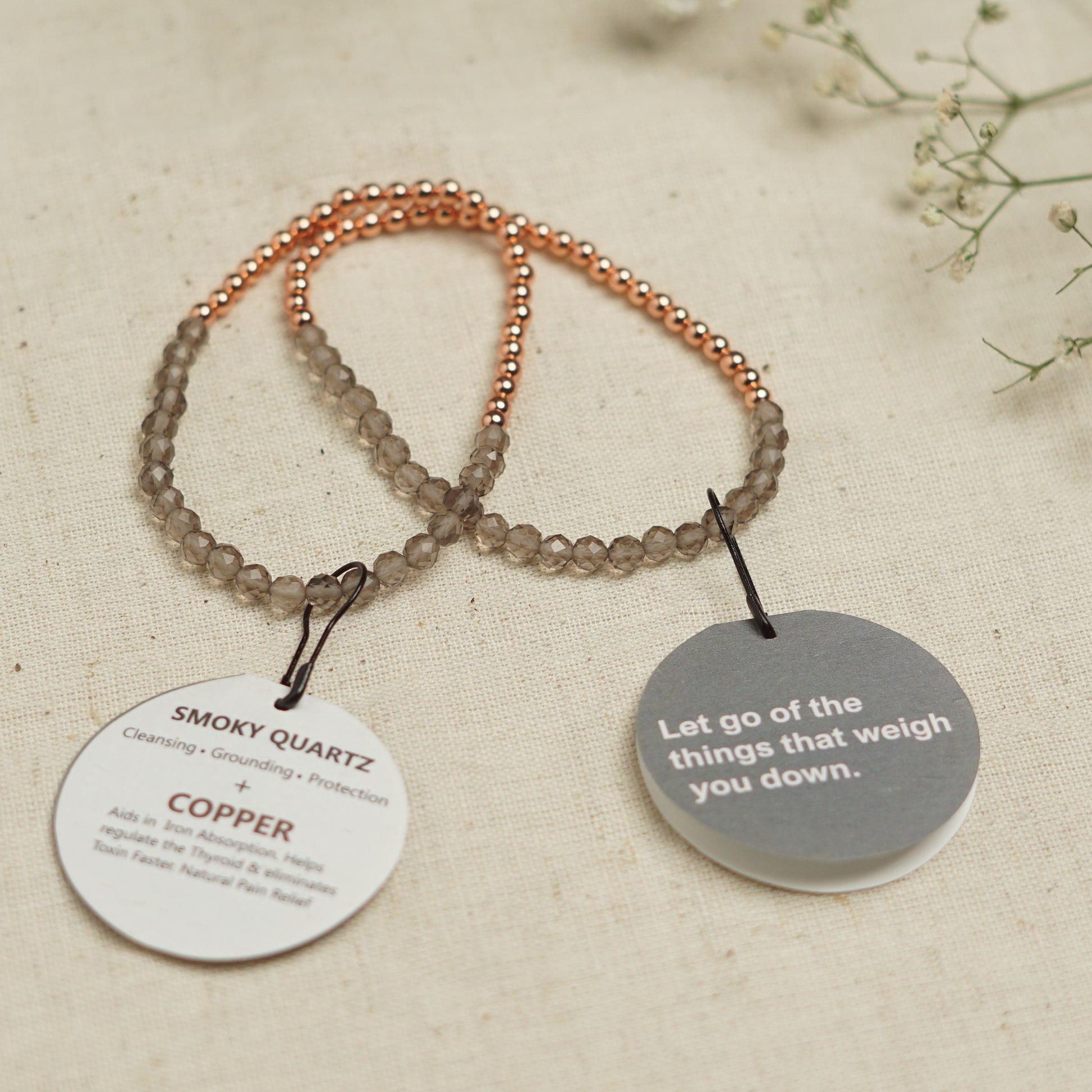 Dainty and Minimal Stretchy bracelets with multi-faceted 4mm Smoky Quartz + 3mm Solid copper beads