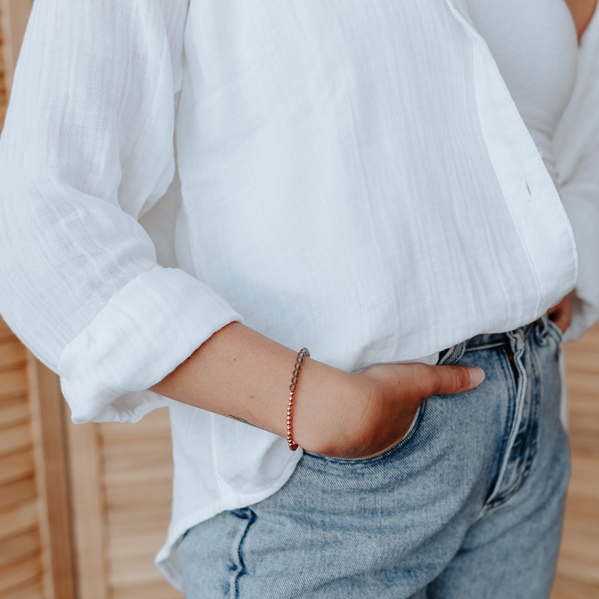 Dainty Copper Bracelet with Faceted Smoky Quartz Beads - Stretchy and Stackable