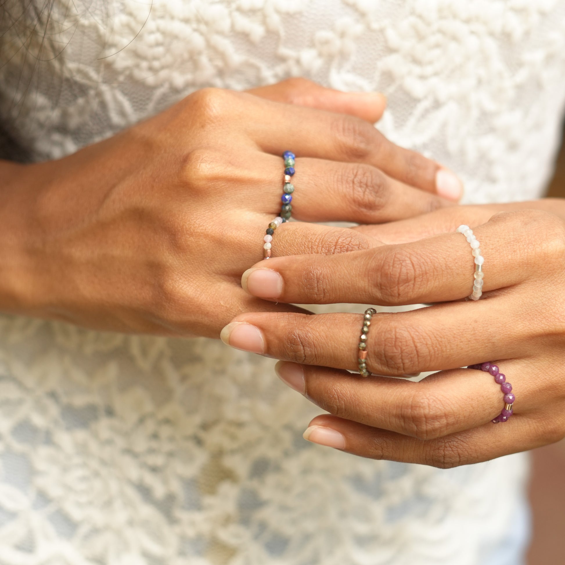 This beautiful range of natural gemstone bead rings is designed with light-catching, faceted stones to create a minimalistic yet striking accessory. Designed with high-quality, faceted natural stones, these rings catch and reflect light beautifully, creating a mesmerizing sparkle. Ideal as fidgets, they provide a grounding and tactile experience to soothe the feeling of anxiety, enhance focus, or simply offer moments of mindful relaxation.